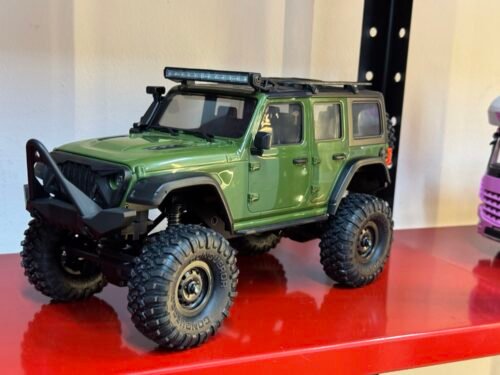 Modelo radio control con carrocería de Jeep Rubicon. Un modelo mini que puedes usar en cualquier lugar y fácil de llevar. Cuenta dirección y aceleración proporcional, resistente a salpicaduras, es 4WD. Cuenta con una distancia del control de aproximadamente 35 metros, motor de escobillas de 280. Incluye una barra LED de iluminación completamente funcional acompañada de luces manejadas directamente desde el control, bombillería funcional tanto adelante como atrás y alineación directa desde el control. Ofrece capacidad de exigencia media-alta.