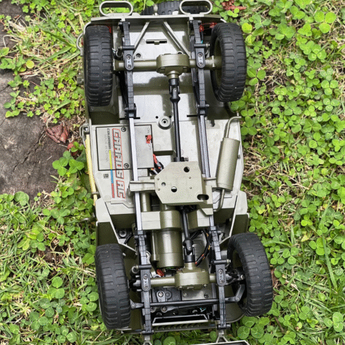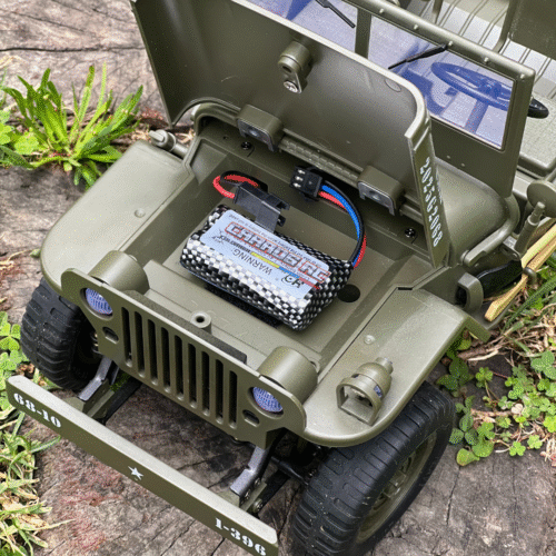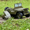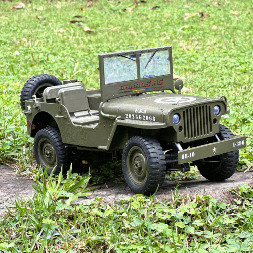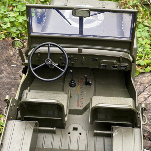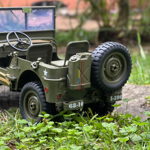 Modelo radio control con carrocería de Jepp Willys con un detallado impresionante, descapotado, viene con detallado interior y exterior. cuenta con bidones, pala y machete, espejos retrovisores, tiene iluminación completamente funcional acompañada de luces manejadas directamente desde el control, dirección y aceleración proporcional, alineación directa desde el control. Ofrece capacidad de exigencia media-alta y cargador. Lo mas divertido es que cuando se mueves la dirección en el control el volante del carro también se mueve.