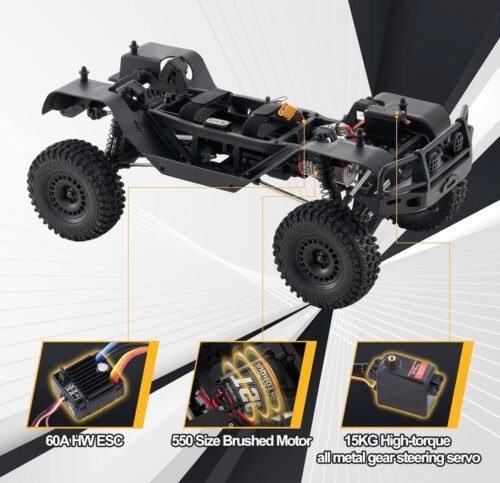 - Sistema de energía eficiente: equipado con un motor cepillado 550 de alto rendimiento y el reconocido HobbyWing 60A ESC, que ofrece una potencia fuerte, estable y linealmente controlable.