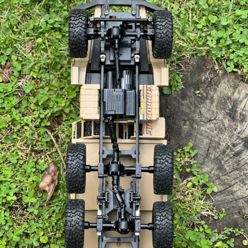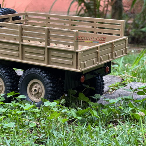 Modelo radio control militar doble troque un camión con 3 ejes y dos ejes de tracción conocido como 6×6 con diseño realista fiel copia de REO, un camión insignia militar, cuenta con volcó detallado para carga. interior y exterior detallado. este carro esta fabricado para ser duradero y cuenta con un motor de escobillado.